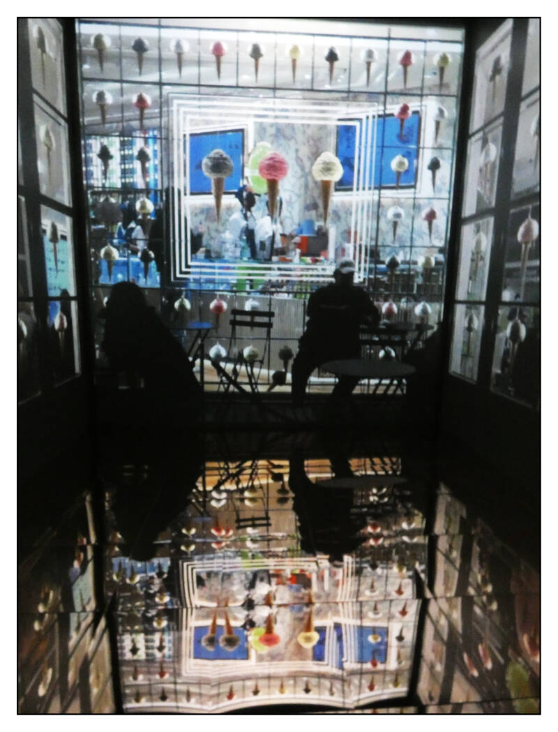 De audiovisuele installatie 'TOO MUCH SWALLOW ' van Pip Greenaway (2000) reconstrueert een winkel waar een driekanaalsvideo illusoire etalages van straten in West-Europa toont.